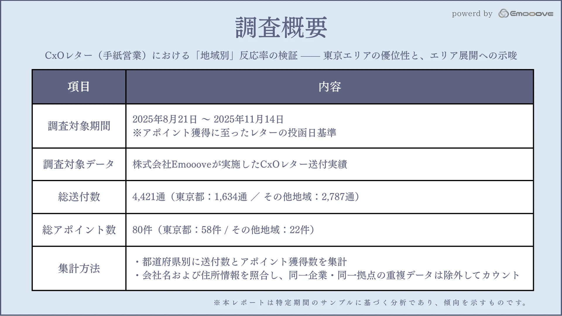 新時代の営業手法を提案する株式会社Emooove(本社:東京都品川区、代表取締役CEO:藤澤諒一)は、同社が運営するオウンドメディア「シン・セールス総合研究所」において、決裁者向けCxOレター(手紙営業)における「地域別の反応率差異」に関する分析レポートを公開しました。