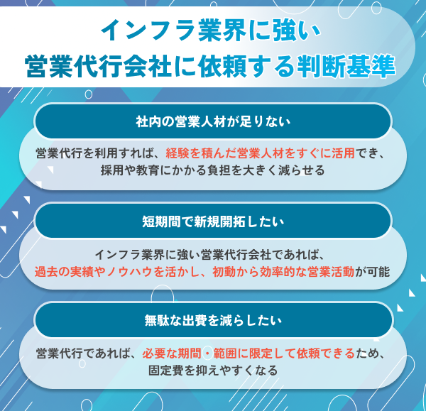 こうした背景から、インフラ業界の特性を理解した営業代行会社の活用が注目されています。
