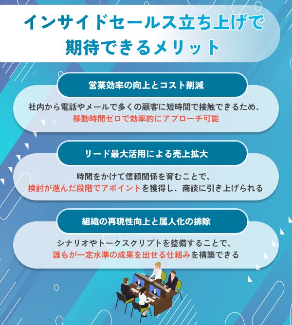 インサイドセールス部門を立ち上げると、営業効率やコスト面でさまざまなメリットが期待できます。
