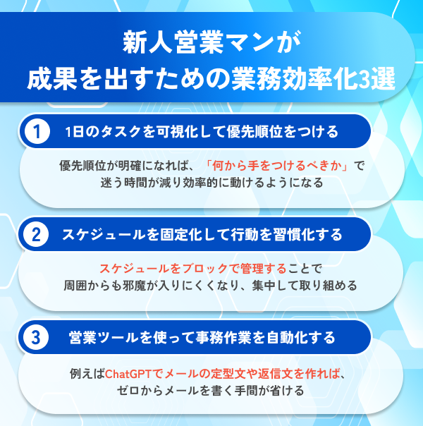 成果を出すために新人営業マンが具体的に取り組むべき事柄を見ていきます。