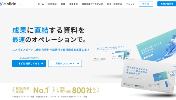 | c-slide | ![]() | 公式 | 詳細 | ・最短翌日納品のスピード対応 ・明確な料金プランと透明性 ・成果につながる資料を追求 |