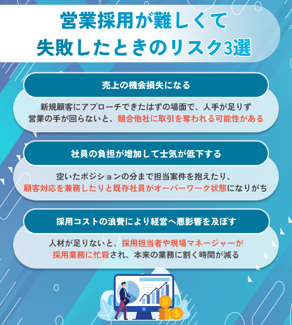 さらに、営業職は離職率が高く、いったん採用しても短期間で人材が流出しやすい傾向があります。