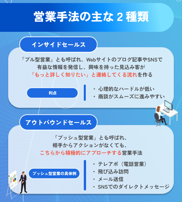 自社から積極的にアプローチする「アウトバウンド営業」と、見込み客からの問い合わせを待つ「インバウンド営業」です。