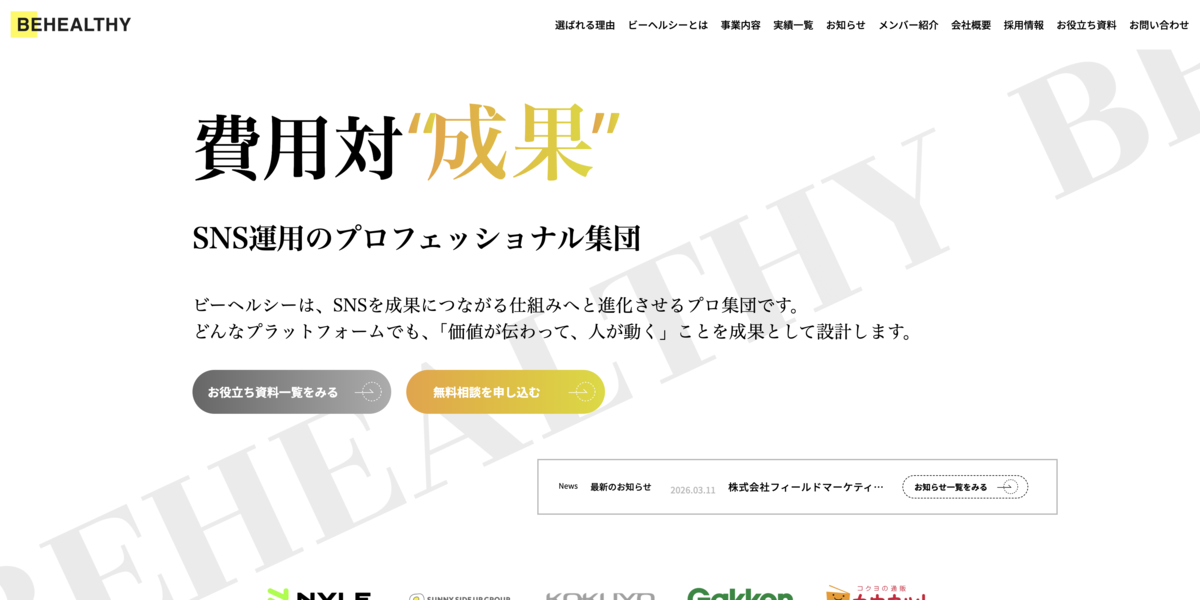 | 株式会社ビーヘルシー | ![]() | 公式 | 詳細 | ・YouTube中心の戦略実装型SNS運用支援 ・企画から分析改善までの一貫支援体制 ・成果に直結する構成・改善が得意 |