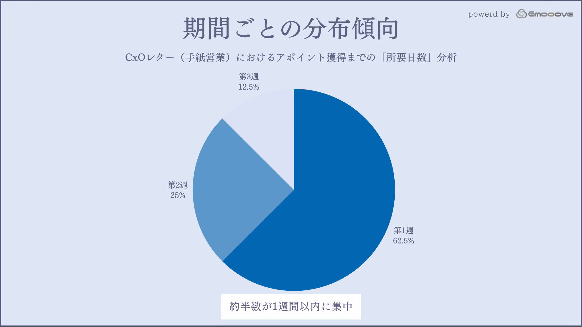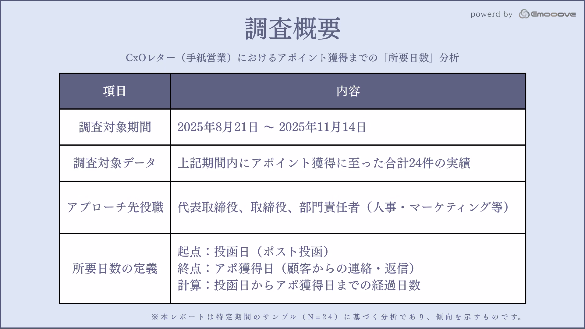 本レポートでは、株式会社Emoooveの支援実績に基づき、CxOレターの投函からアポイント発生までの期間(所要日数)を分析した。経験則で語られがちな「待機期間」を数値化し、営業スケジュール設計の判断材料とすることを目的とする。