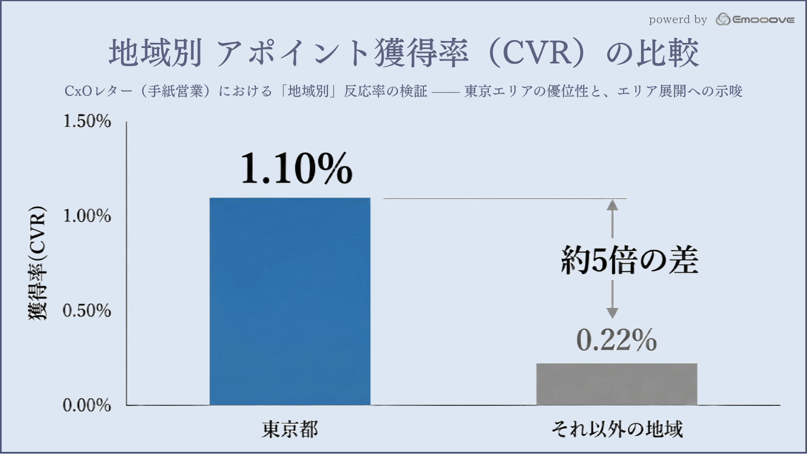 リソースが限られている場合、まずは東京都内の企業をターゲットリストの最優先順位に据えるのが合理的である。今回のデータが示す通り、投資対効果の観点から、まずは確実性の高い東京エリアで検証サイクルを回すことが推奨される。