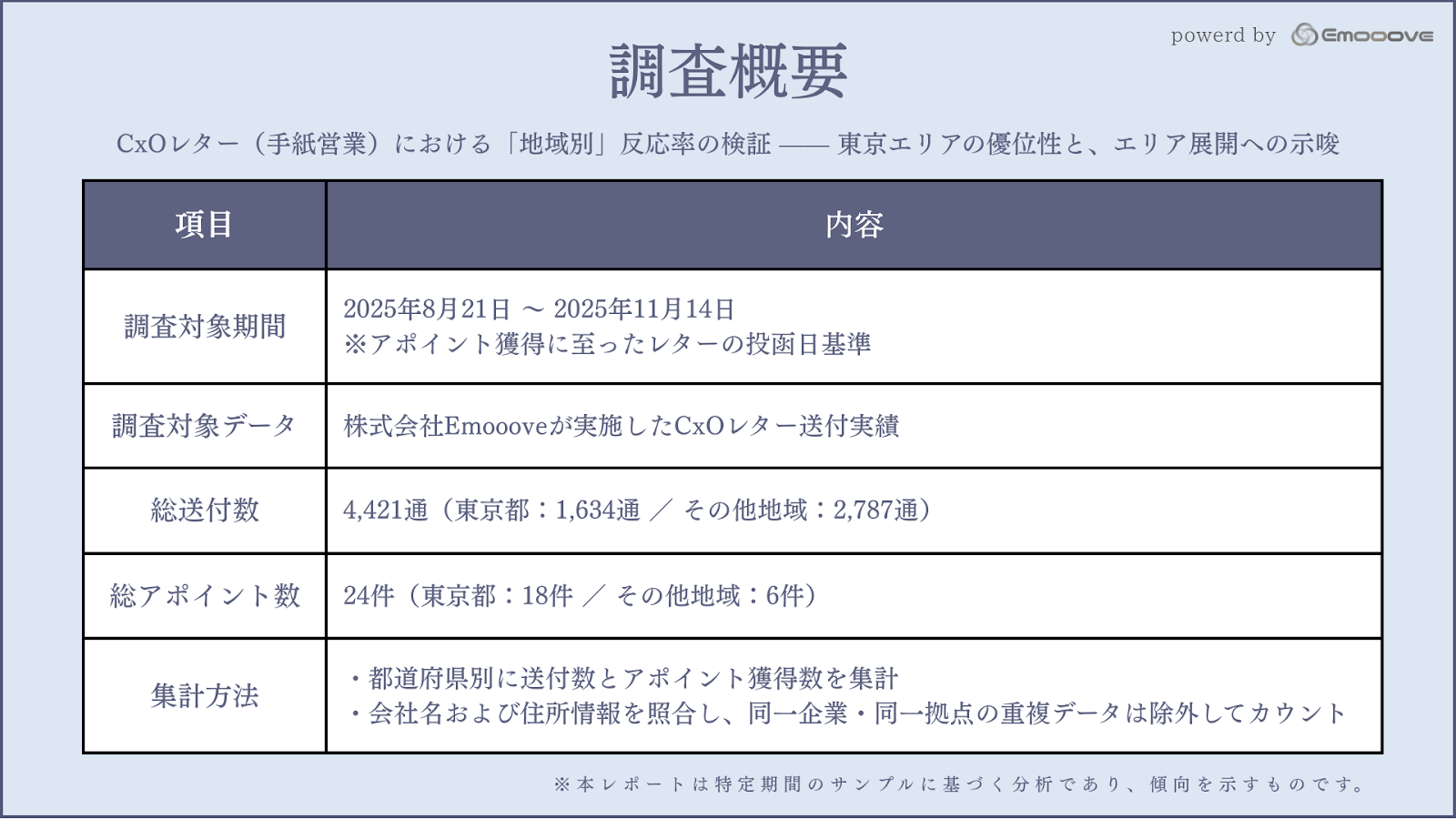 - CxOレターにおいては「まず東京から着手する」ことが効率的であり、地方展開には「他県から送付する違和感」を払拭する工夫(高度なパーソナライズ等)が必要であると推察される